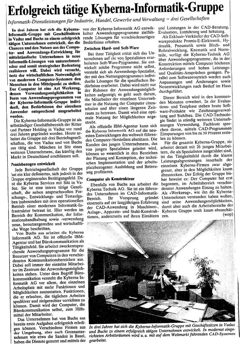 Als die «Kyberna Service Anstalt» 1986 gegründet wurde, war das digitale Zeitalter noch weit entfernt: Kein Internet, keine Smartphones, keine Laptops. Ursprünglich zur IT-Unterstützung innerhalb der Ritter & Partner Holding gedacht, war KYBERNA zeitgleich in Buchs SG als IBM-Partner aktiv. Dort wurden auf Grossrechnern erste Personallösungen für namhafte Kunden im öffentlichen Sektor der Schweiz entwickelt.